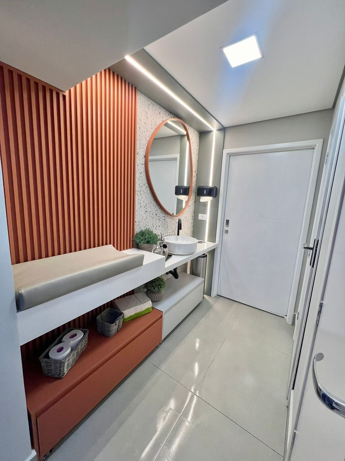 Nesse ambiente, os clientes buscavam um espaço alegre, vibrante e que refletisse a identidade da empresa. A proposta foi criar uma atmosfera descontraída e acolhedora, utilizando cores marcantes, revestimento em granilite, espelho orgânico e perfis de iluminação estratégicos. Um detalhe essencial foi a inclusão de um espaço para trocador, especialmente importante no período de volta às aulas, quando seu uso se torna ainda mais frequente.
