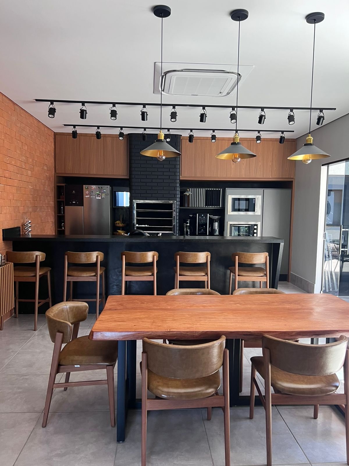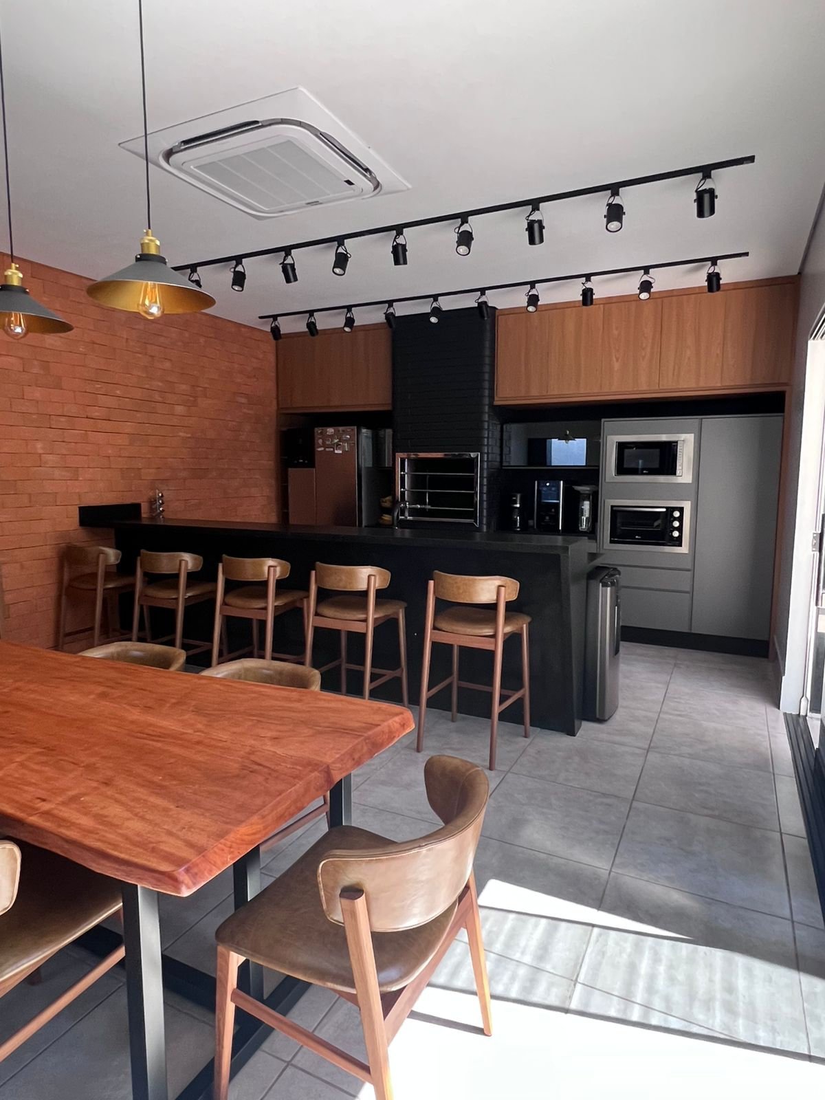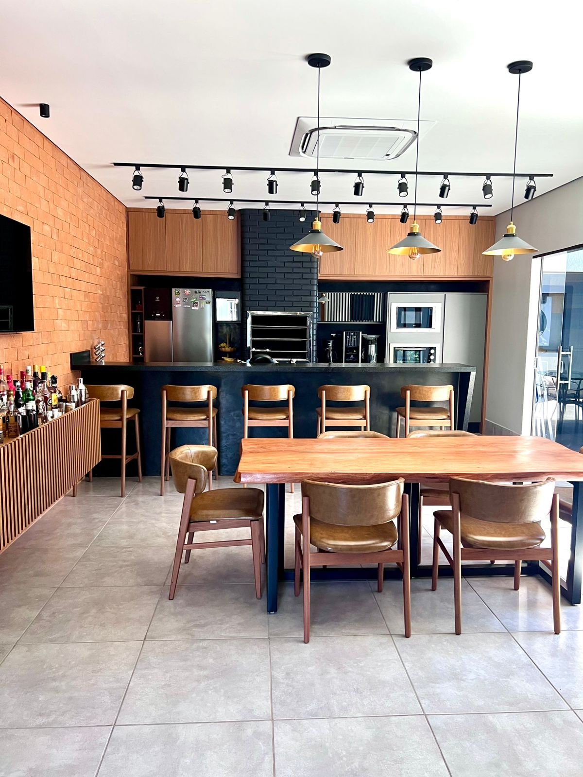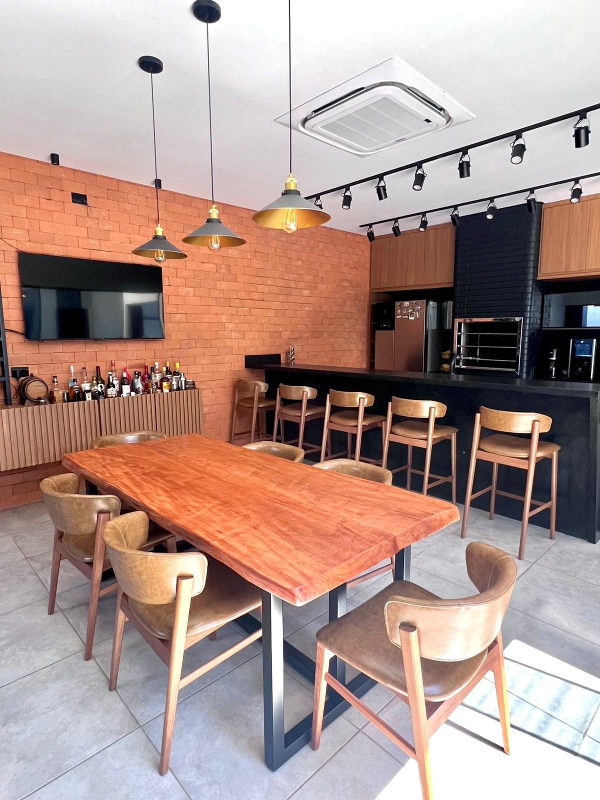 Neste espaço gourmet, os clientes buscavam uma área ampla e acolhedora para receber seus convidados, aproveitando alguns itens que já possuíam, como por exemplo, o tampo da mesa foi reaproveitado, ganhando uma nova base em metalon, e a churrasqueira existente recebeu pintura preta, trazendo unidade visual ao ambiente. Optamos por revestimentos em tijolo aparente, que harmonizam com a paleta predominante de tons amadeirados, preto e cinza. O resultado é um espaço que equilibra perfeitamente o estilo industrial com toques modernos