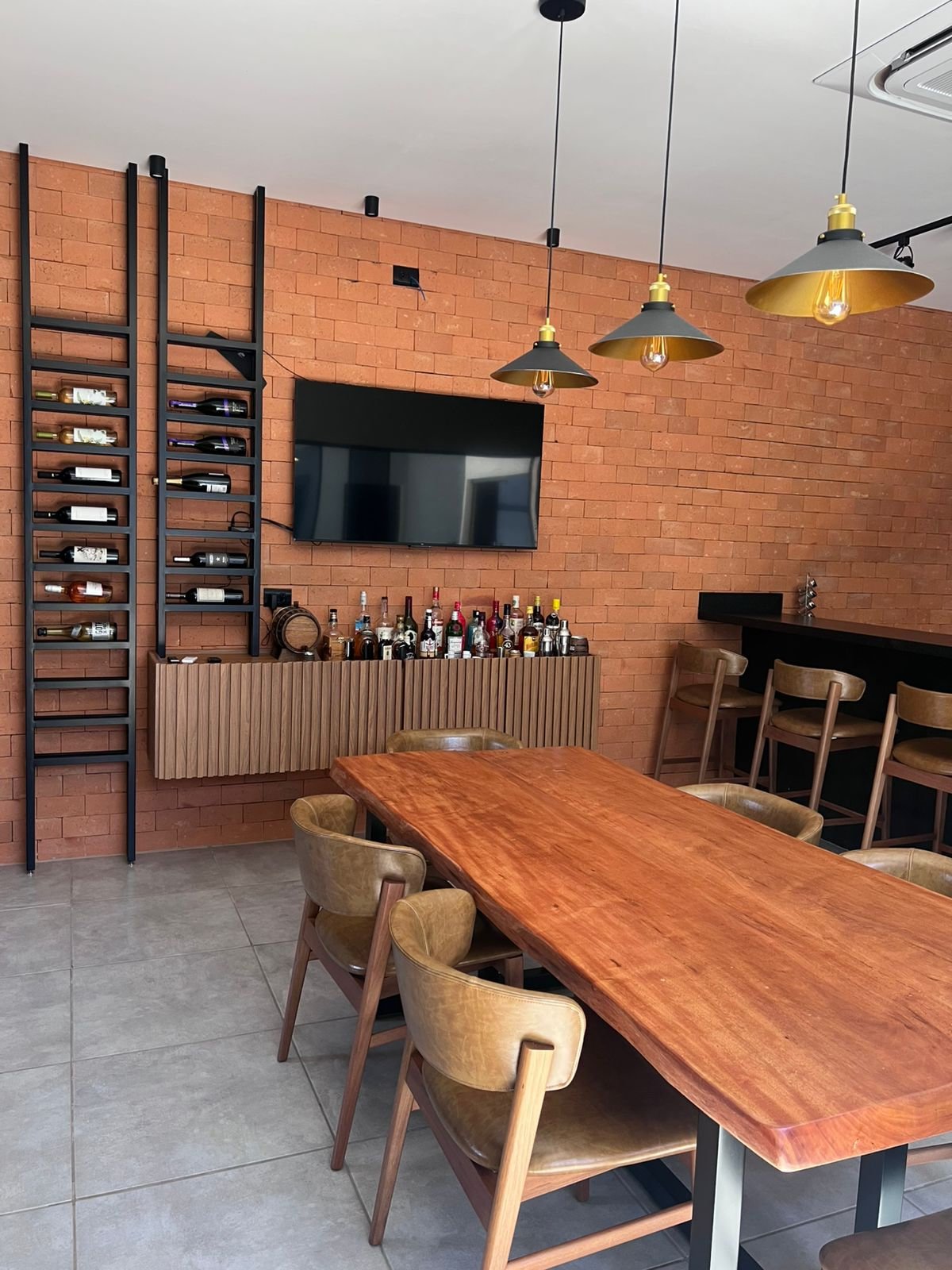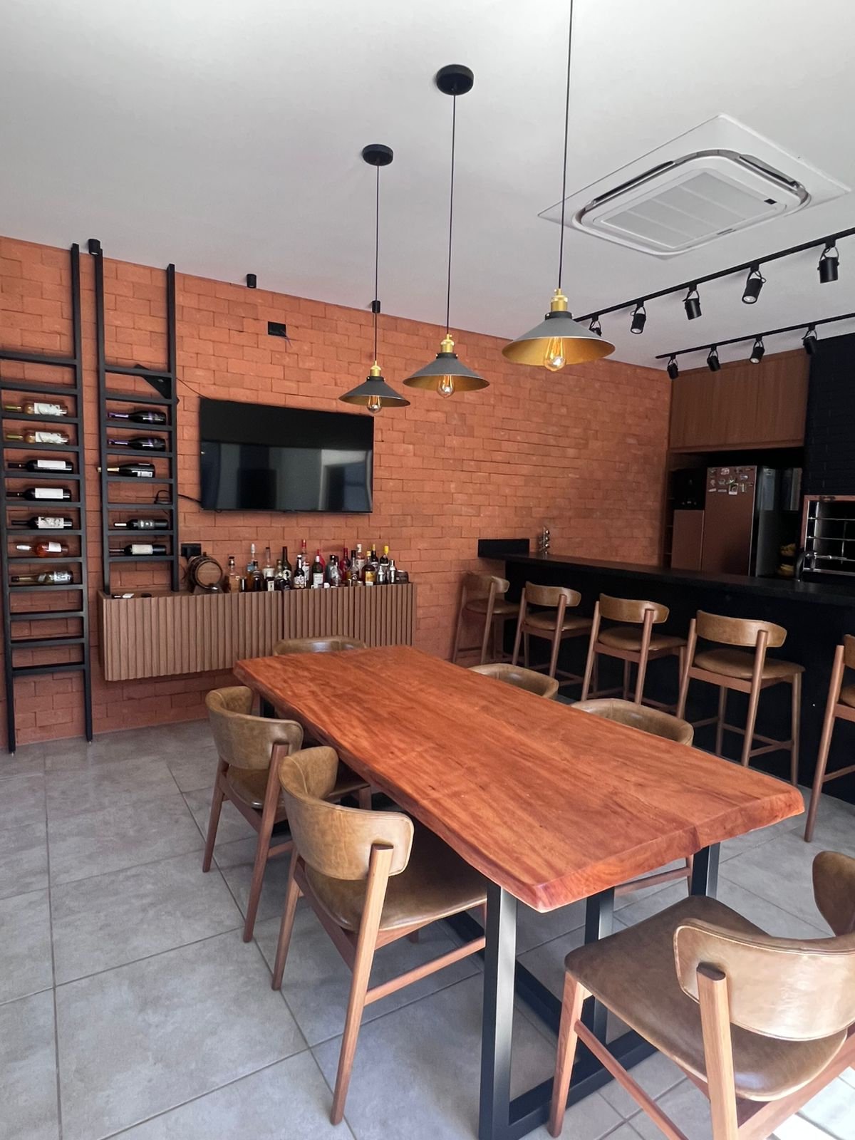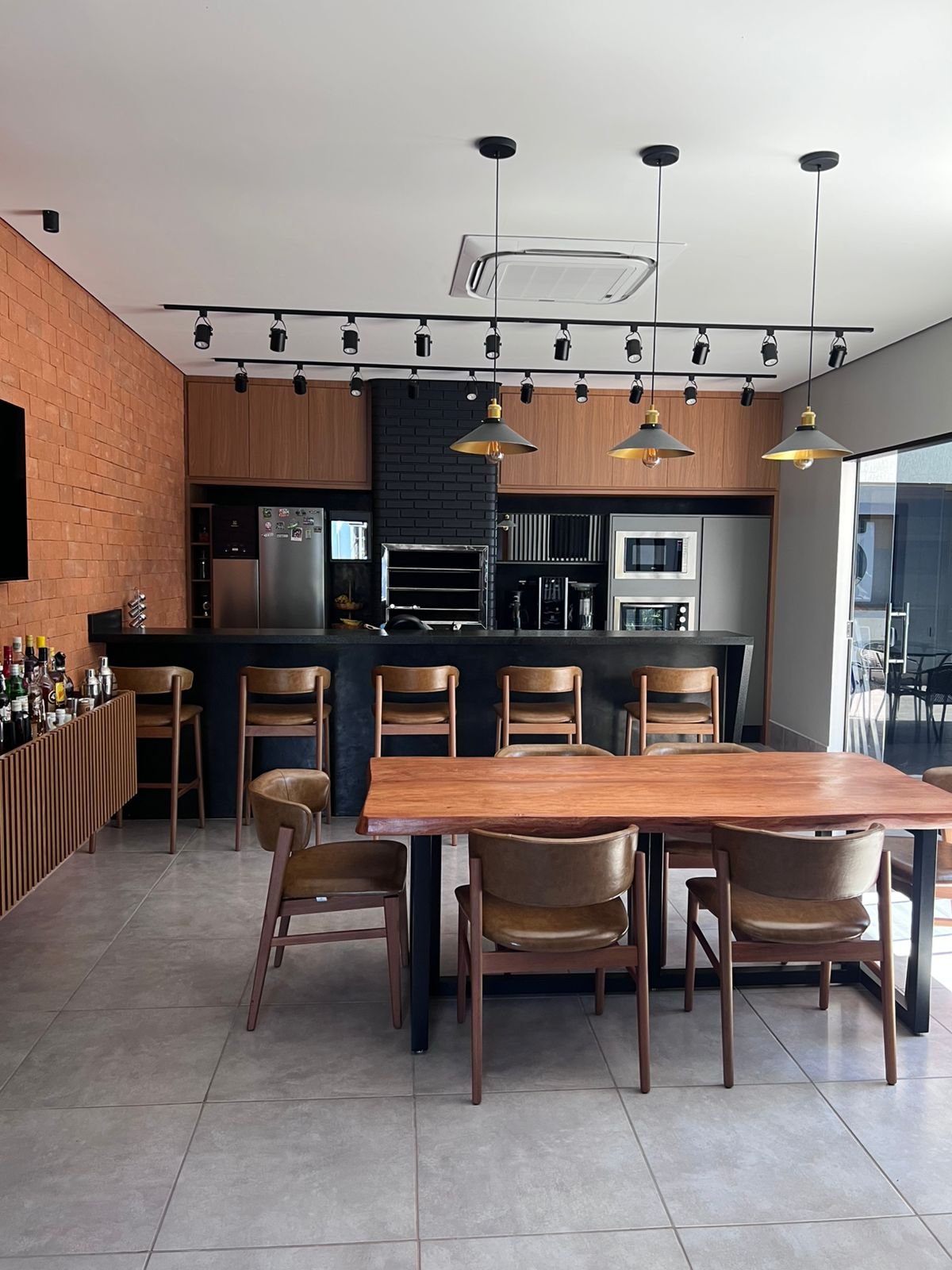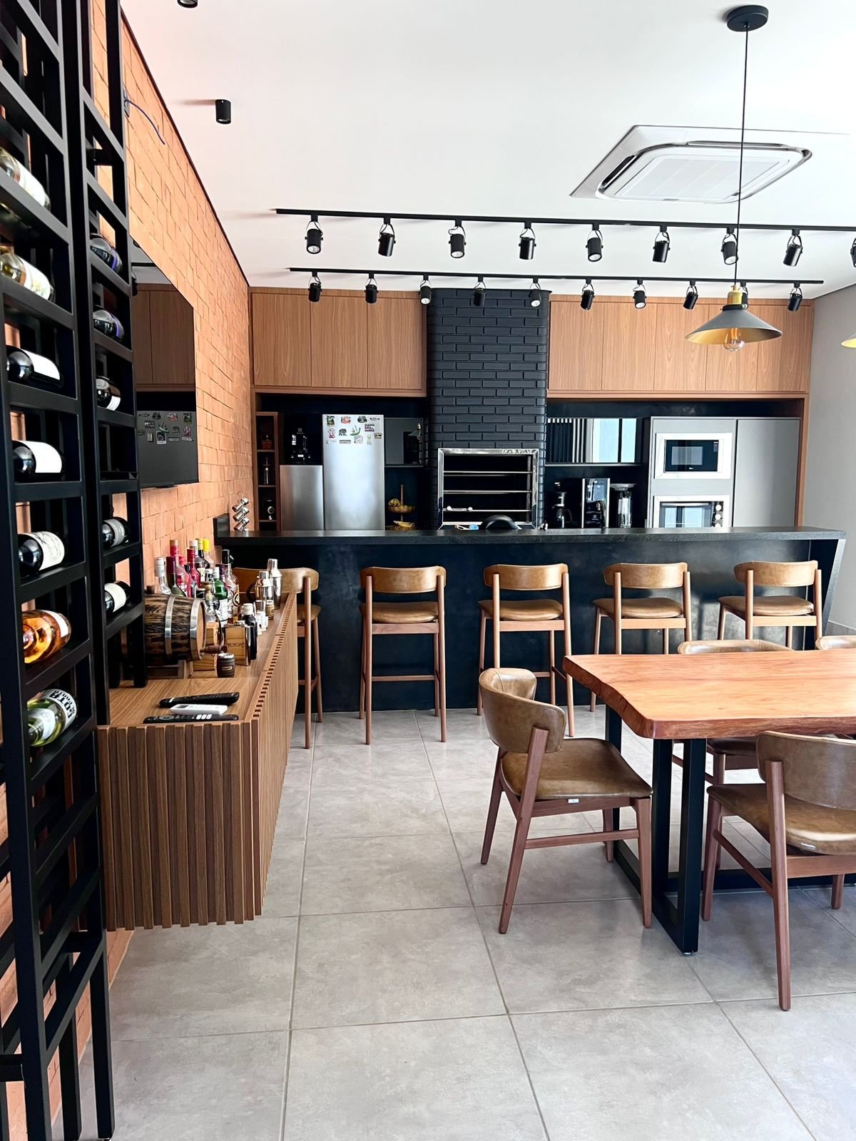 Neste espaço gourmet, os clientes buscavam uma área ampla e acolhedora para receber seus convidados, aproveitando alguns itens que já possuíam, como por exemplo, o tampo da mesa foi reaproveitado, ganhando uma nova base em metalon, e a churrasqueira existente recebeu pintura preta, trazendo unidade visual ao ambiente. Optamos por revestimentos em tijolo aparente, que harmonizam com a paleta predominante de tons amadeirados, preto e cinza. O resultado é um espaço que equilibra perfeitamente o estilo industrial com toques modernos